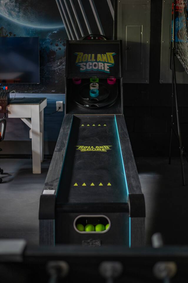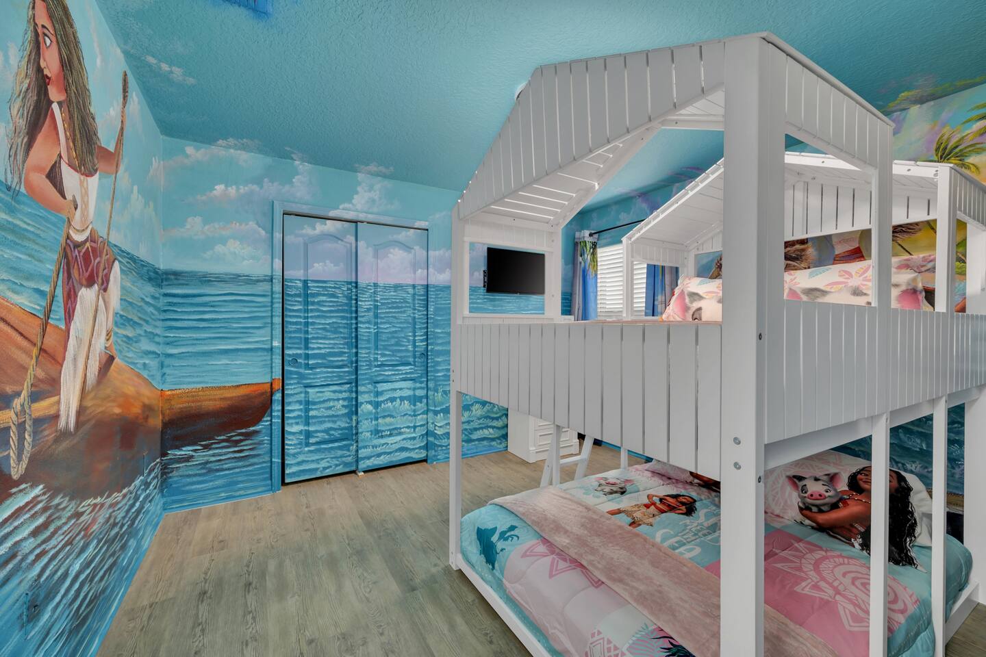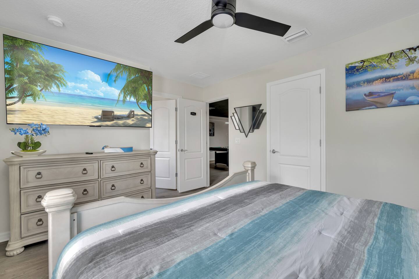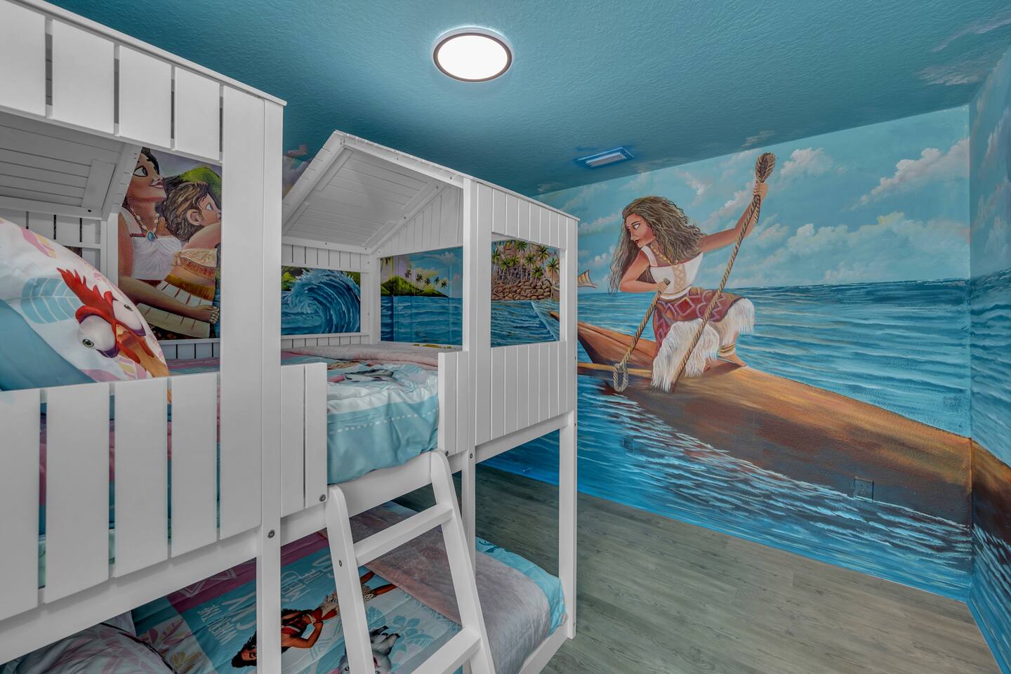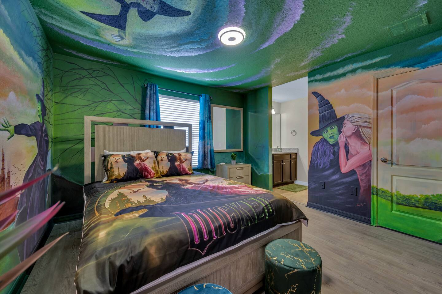 Indulge in lakeside luxury at this stunning 9BR/6BA villa just minutes from Disney. Enjoy 4 king beds, 3 queen beds & 2 full-over-full bunks w/ 14TVs. Relax in your private pool, spa, tiki bar & BBQ patio with serene lake views. Play in a fully loaded game room—arcade, poker, air hockey & more. Watch movies in the home theater or unwind by ambient fireplaces. Includes 3 breathtaking artist painted themed rooms—Moana, Wicked, Gamer’s Den. Steps away to clubhouse, pool,bar,gym,sports,food,arcade..
