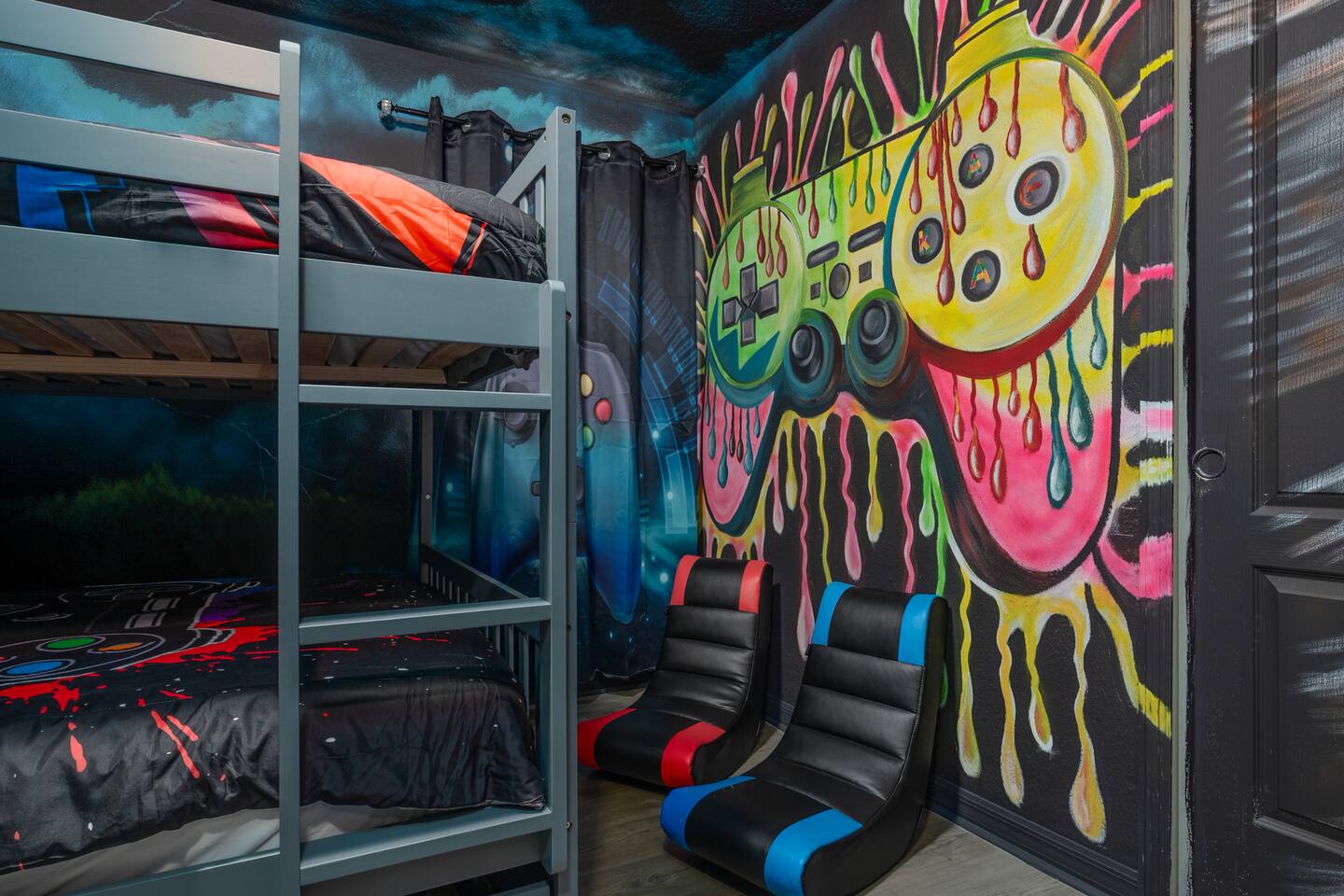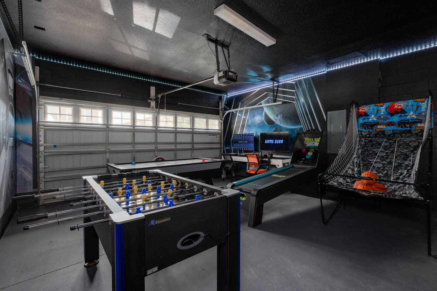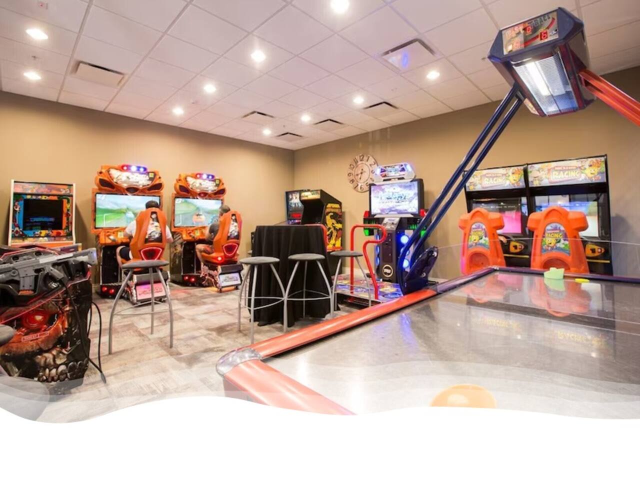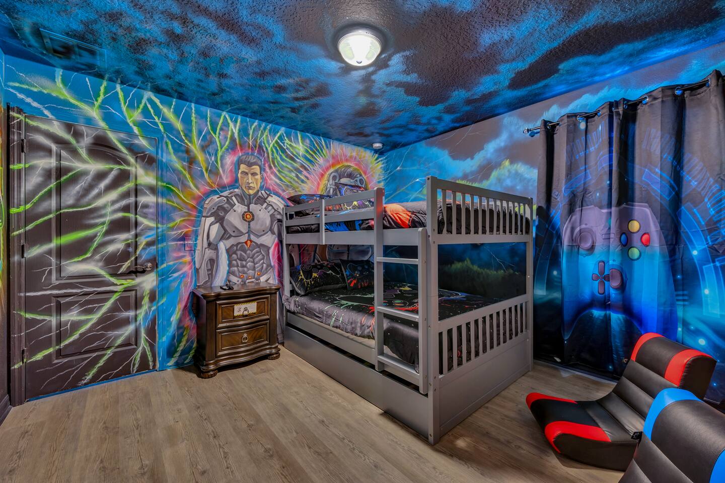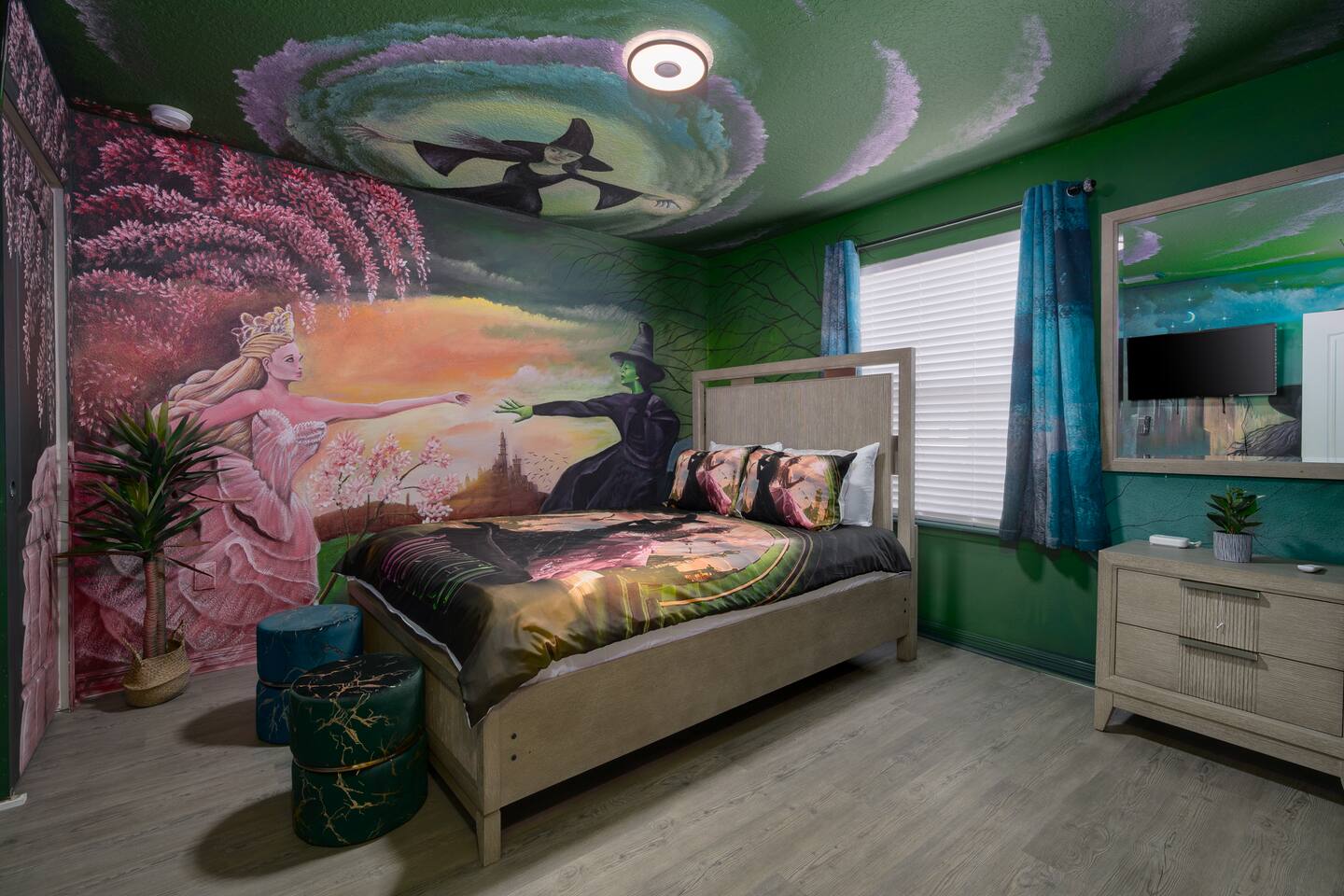 Indulge in lakeside luxury at this stunning 9BR/6BA villa just minutes from Disney. Enjoy 4 king beds, 3 queen beds & 2 full-over-full bunks w/ 14TVs. Relax in your private pool, spa, tiki bar & BBQ patio with serene lake views. Play in a fully loaded game room—arcade, poker, air hockey & more. Watch movies in the home theater or unwind by ambient fireplaces. Includes 3 breathtaking artist painted themed rooms—Moana, Wicked, Gamer’s Den. Steps away to clubhouse, pool,bar,gym,sports,food,arcade..