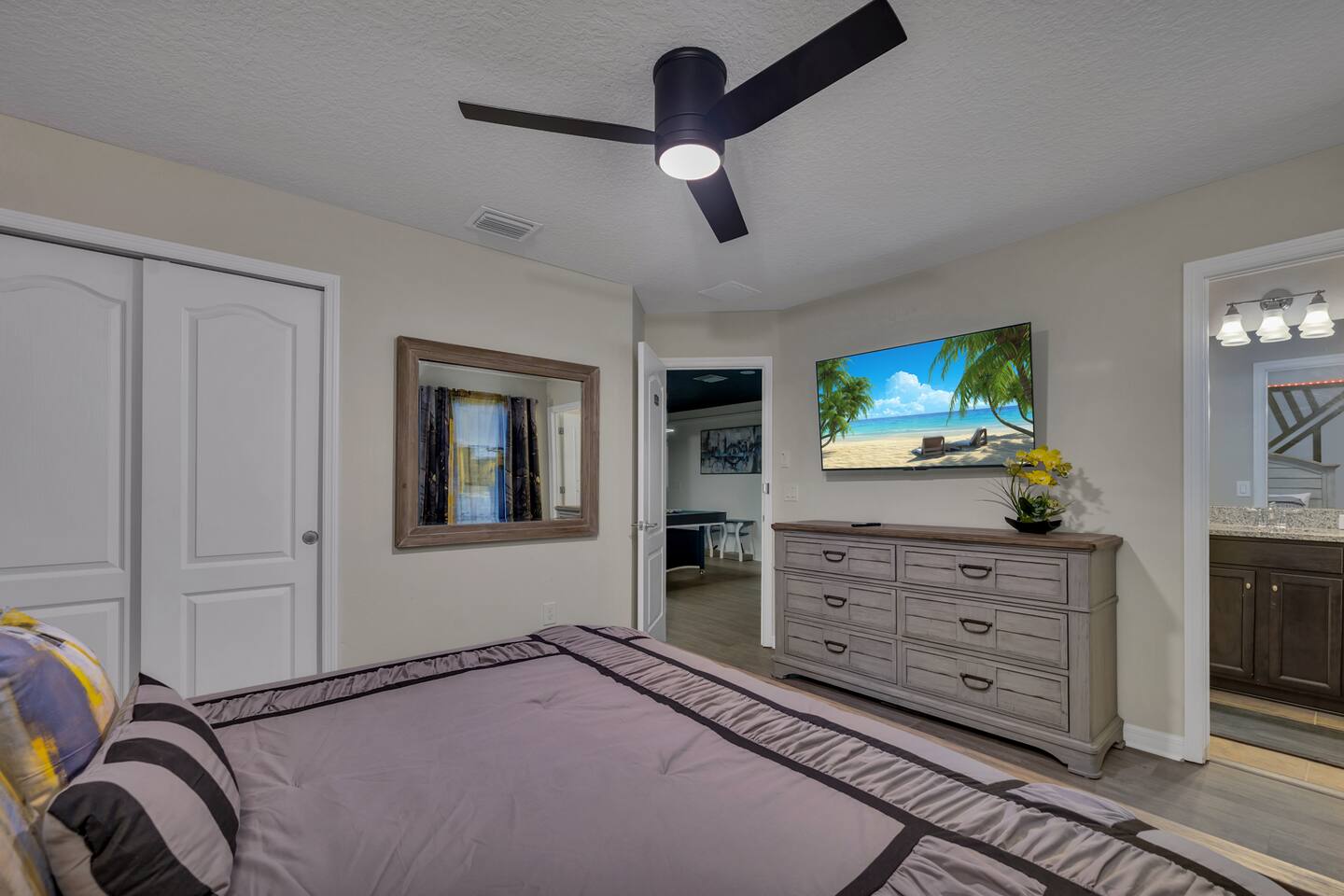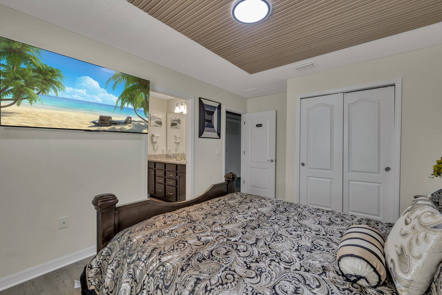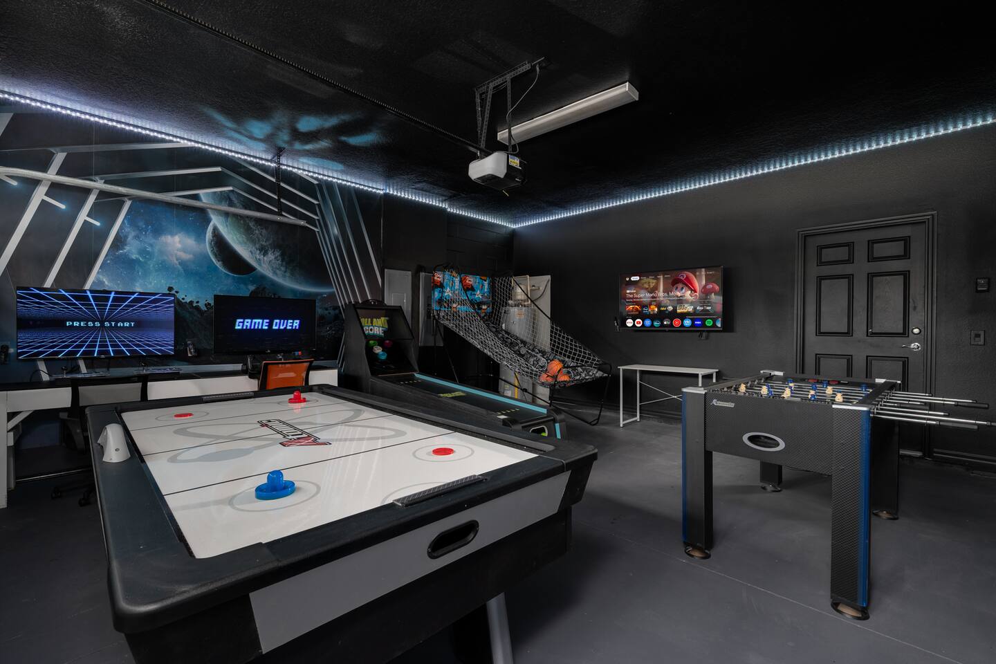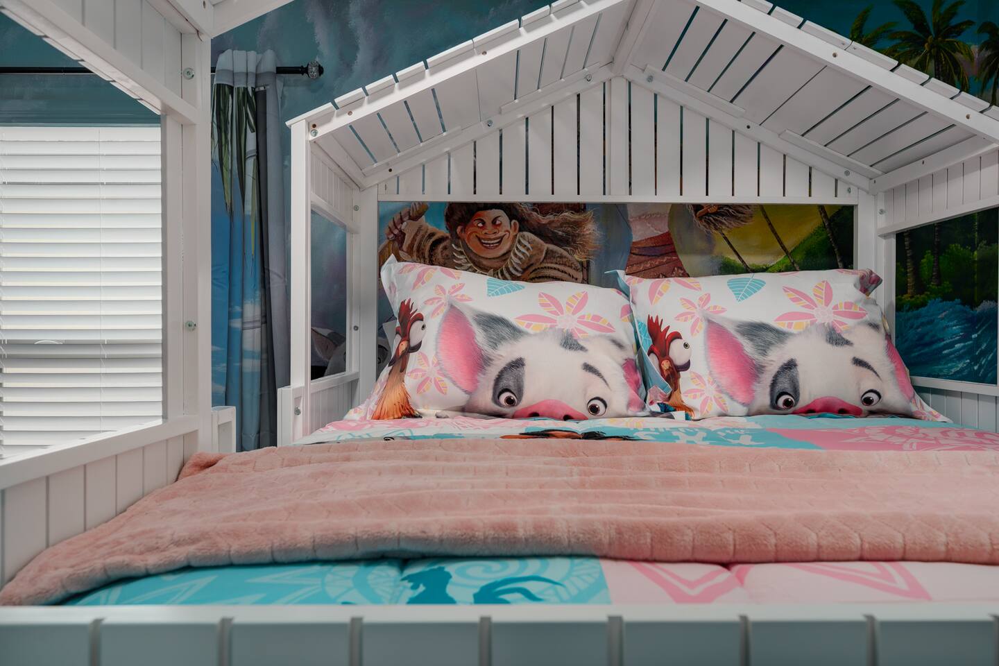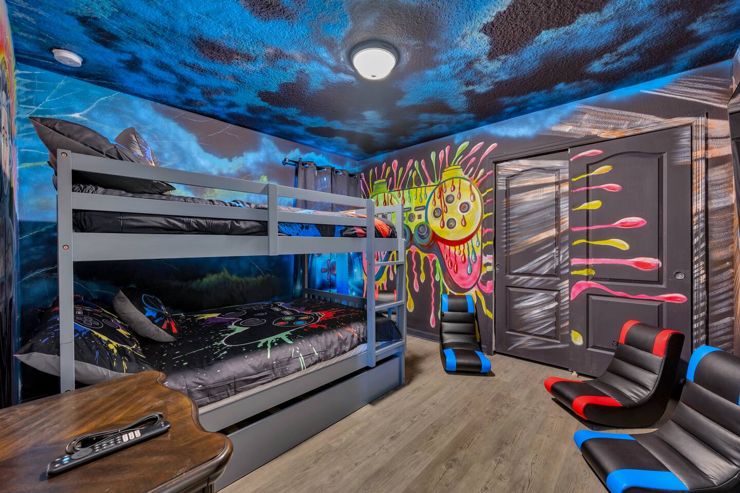 Indulge in lakeside luxury at this stunning 9BR/6BA villa just minutes from Disney. Enjoy 4 king beds, 3 queen beds & 2 full-over-full bunks w/ 14TVs. Relax in your private pool, spa, tiki bar & BBQ patio with serene lake views. Play in a fully loaded game room—arcade, poker, air hockey & more. Watch movies in the home theater or unwind by ambient fireplaces. Includes 3 breathtaking artist painted themed rooms—Moana, Wicked, Gamer’s Den. Steps away to clubhouse, pool,bar,gym,sports,food,arcade..