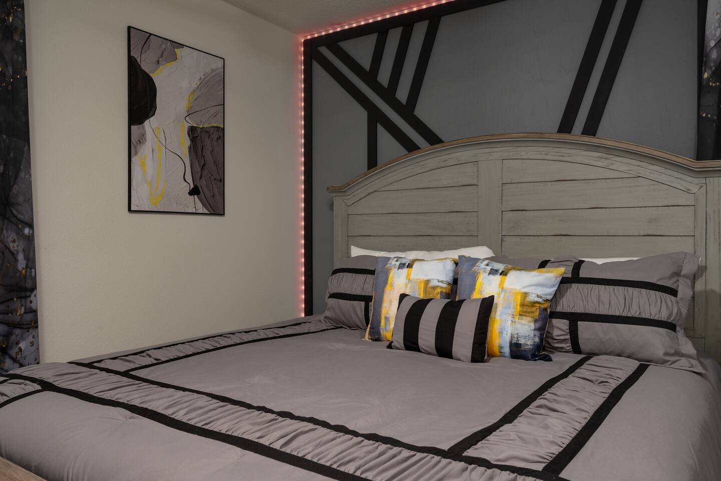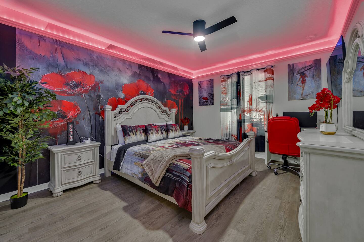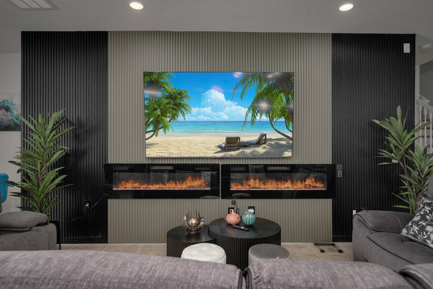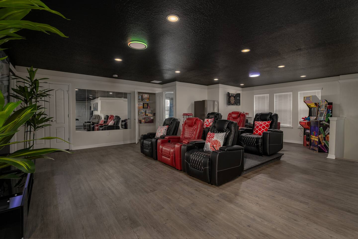 Indulge in lakeside luxury at this stunning 9BR/6BA villa just minutes from Disney. Enjoy 4 king beds, 3 queen beds & 2 full-over-full bunks w/ 14TVs. Relax in your private pool, spa, tiki bar & BBQ patio with serene lake views. Play in a fully loaded game room—arcade, poker, air hockey & more. Watch movies in the home theater or unwind by ambient fireplaces. Includes 3 breathtaking artist painted themed rooms—Moana, Wicked, Gamer’s Den. Steps away to clubhouse, pool,bar,gym,sports,food,arcade..