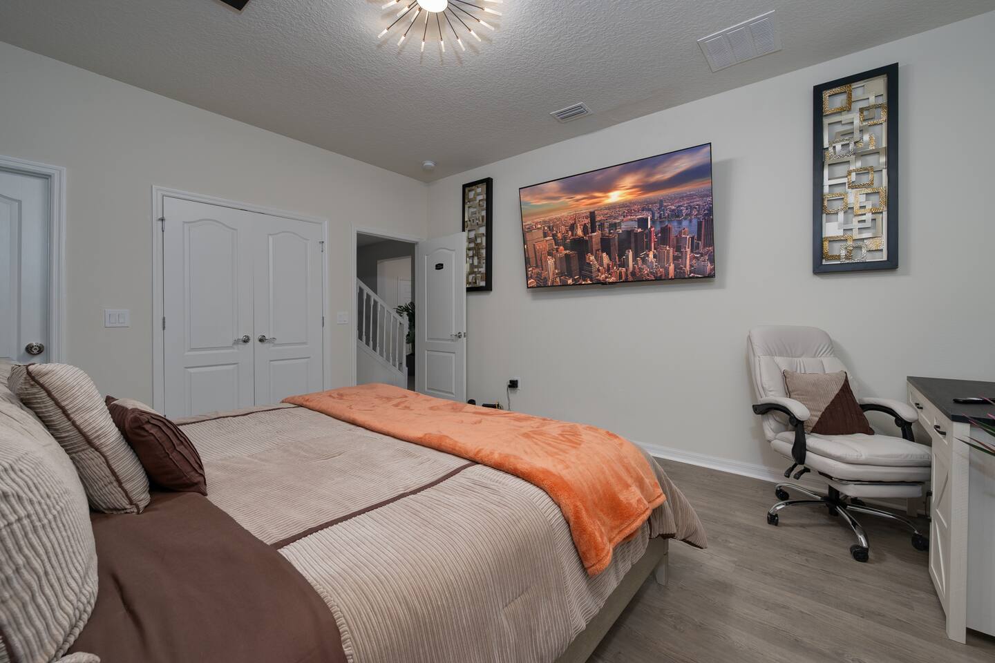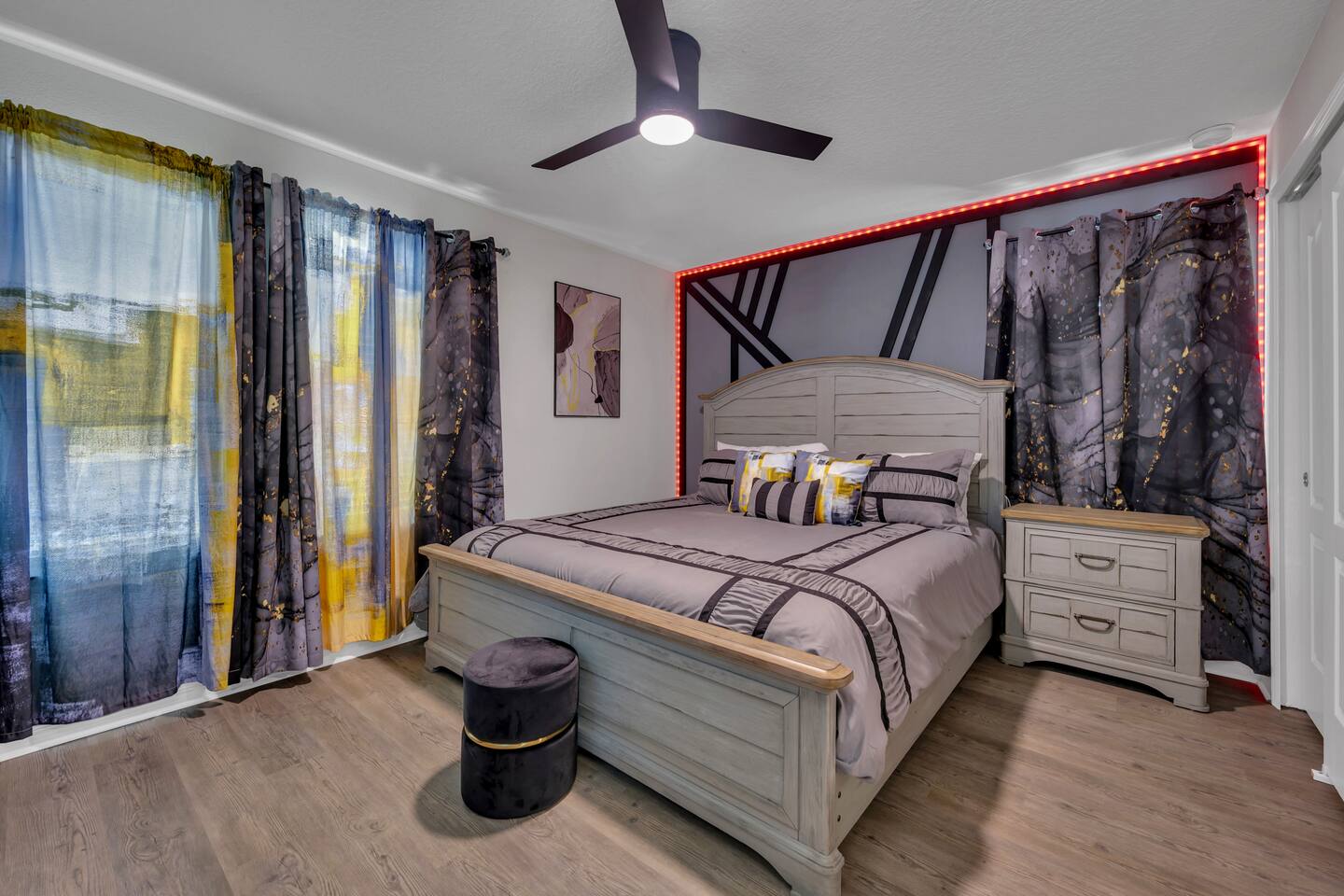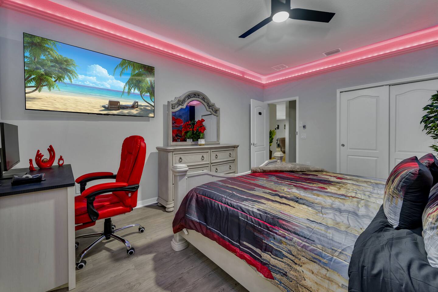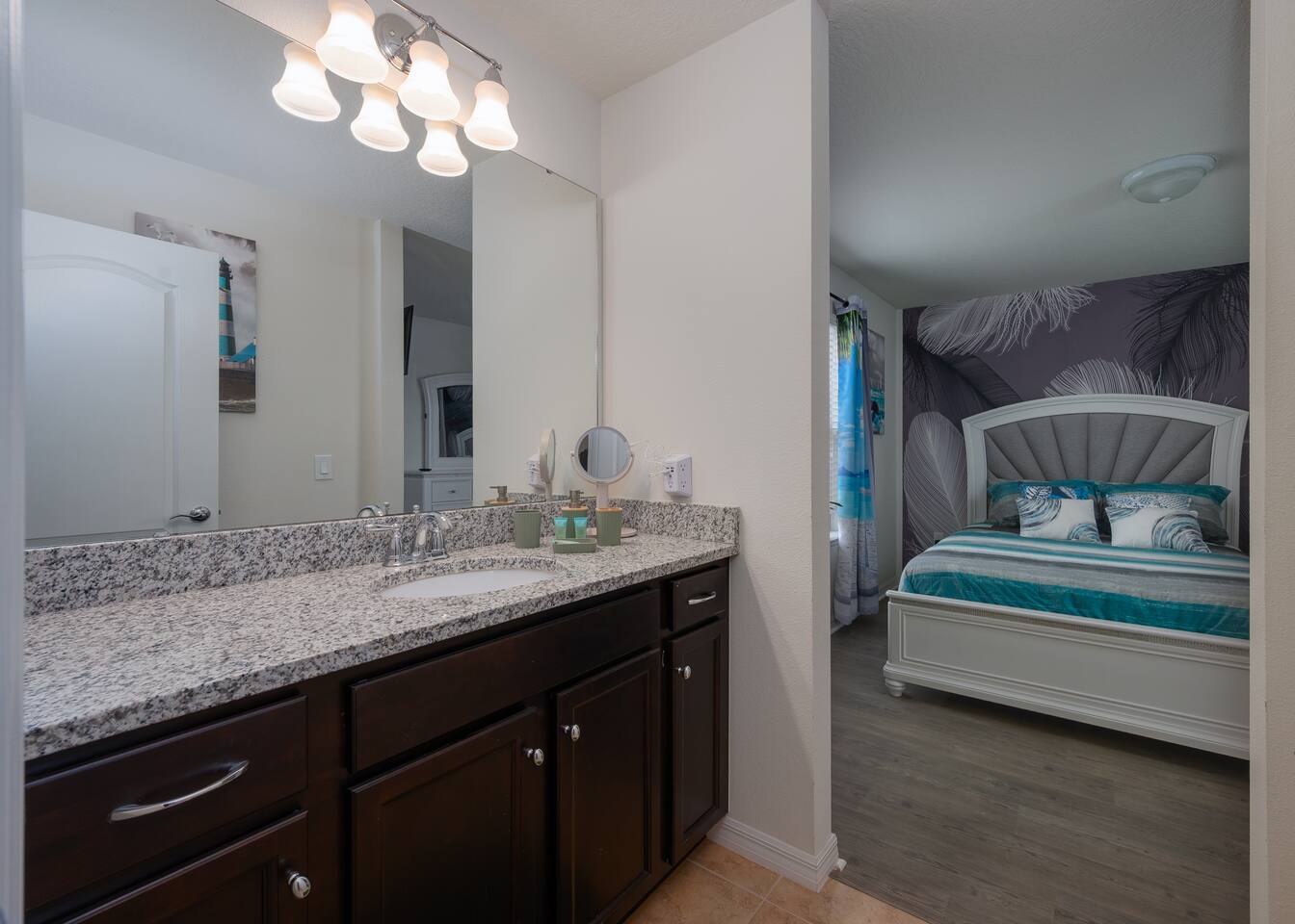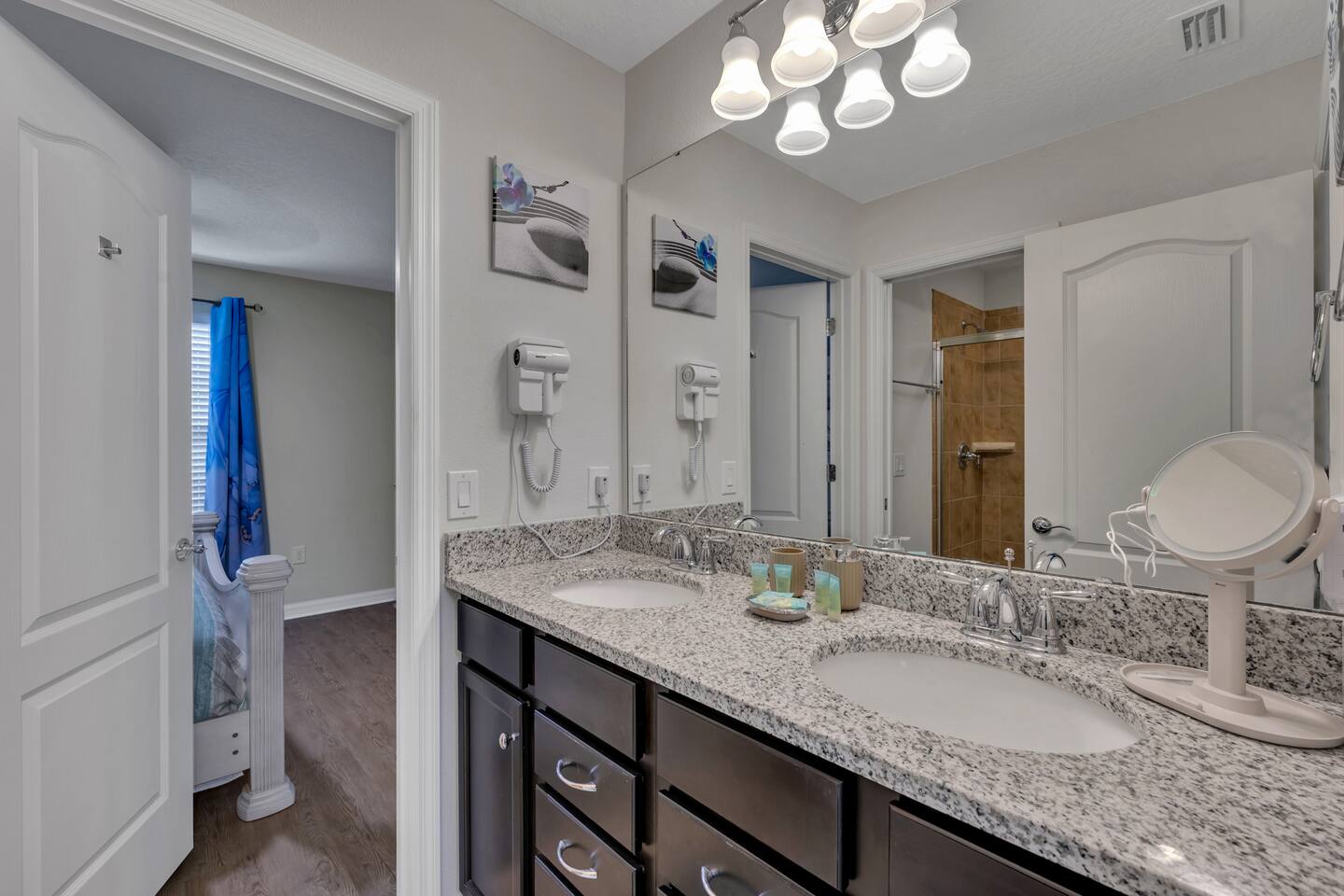 Indulge in lakeside luxury at this stunning 9BR/6BA villa just minutes from Disney. Enjoy 4 king beds, 3 queen beds & 2 full-over-full bunks w/ 14TVs. Relax in your private pool, spa, tiki bar & BBQ patio with serene lake views. Play in a fully loaded game room—arcade, poker, air hockey & more. Watch movies in the home theater or unwind by ambient fireplaces. Includes 3 breathtaking artist painted themed rooms—Moana, Wicked, Gamer’s Den. Steps away to clubhouse, pool,bar,gym,sports,food,arcade..
